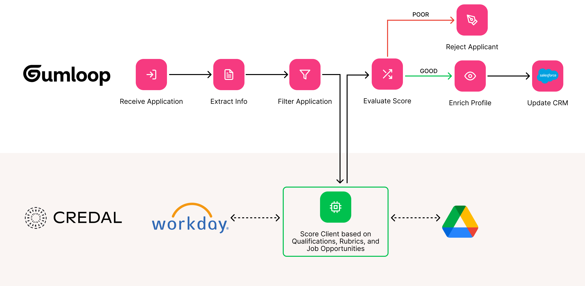Consider an HR department aiming to automate job application processing. The volume of job applications is high, but each one is critical to the organization’s growth. Using a deterministic platform like Gumloop here is a solid foundation but evaluating applications involves nuanced reasoning, which is where Credal comes into play.